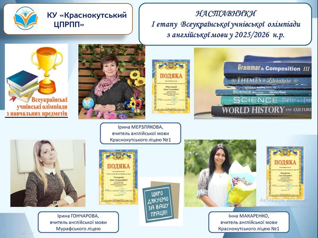Висловлюємо вдячність наставникам, які підготували учнів-переможців І етапу Всеукраїнської учнівської олімпіади з англійської мови у 2025/2026 н.р.: