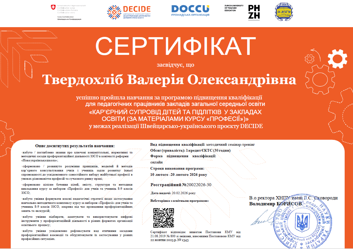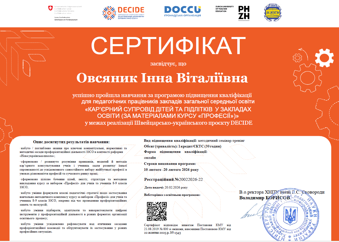 У межах цієї програми протягом лютого відбулося навчання карʼєрних радників “КАРʼЄРНИЙ СУПРОВІД ДІТЕЙ ТА ПІДЛІТКІВ В ЗАКЛАДАХ ОСВІТИ (ЗА МАТЕРІАЛАМИ КУРСУ «ПРОФЕСІЇ»)” (Краснокутський ліцей №1).