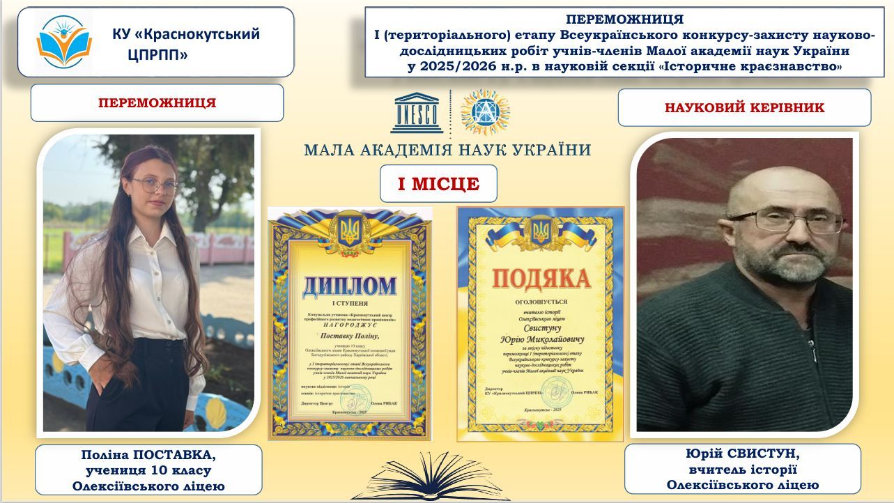 Підсумки І (територіального) етапу Всеукраїнського конкурсу-захисту науково-дослідницьких робіт учнів-членів Малої академії наук України у науковій секції «Історичне краєзнавство» у 2025/2026 н.р.