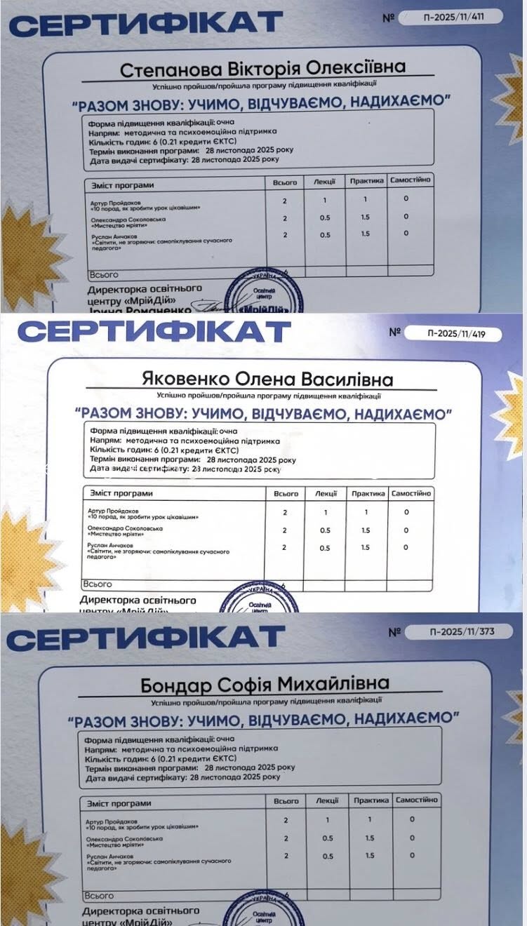 Дякуємо Освітній фундації «MriyDiy» за незабутні зустрічі, цікаве спілкування, нові навички й можливості! Ці дні нагадали освітянам, що професійне зростання – це не лише про методики, а й про людей поруч. Про підтримку, яка з’являється вчасно. Про простір, де можна дозволити собі чесність, спокій і мрії.