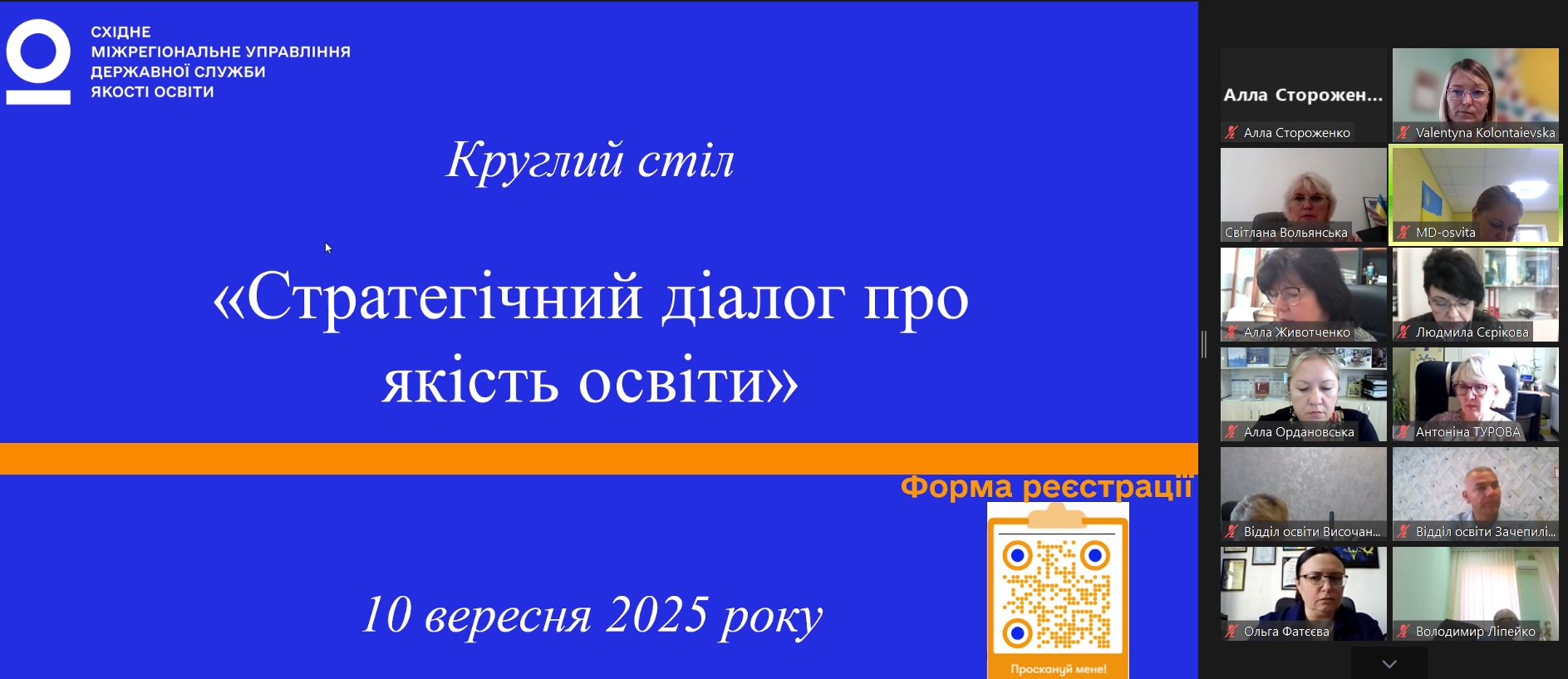 10 вересня 2025 року відбувся круглий стіл з керівниками місцевих органів управлінь освіти Харківської області «Стратегічний діалог про якість освіти», який провело Східне міжрегіональне управління Державної служби якості освіти.