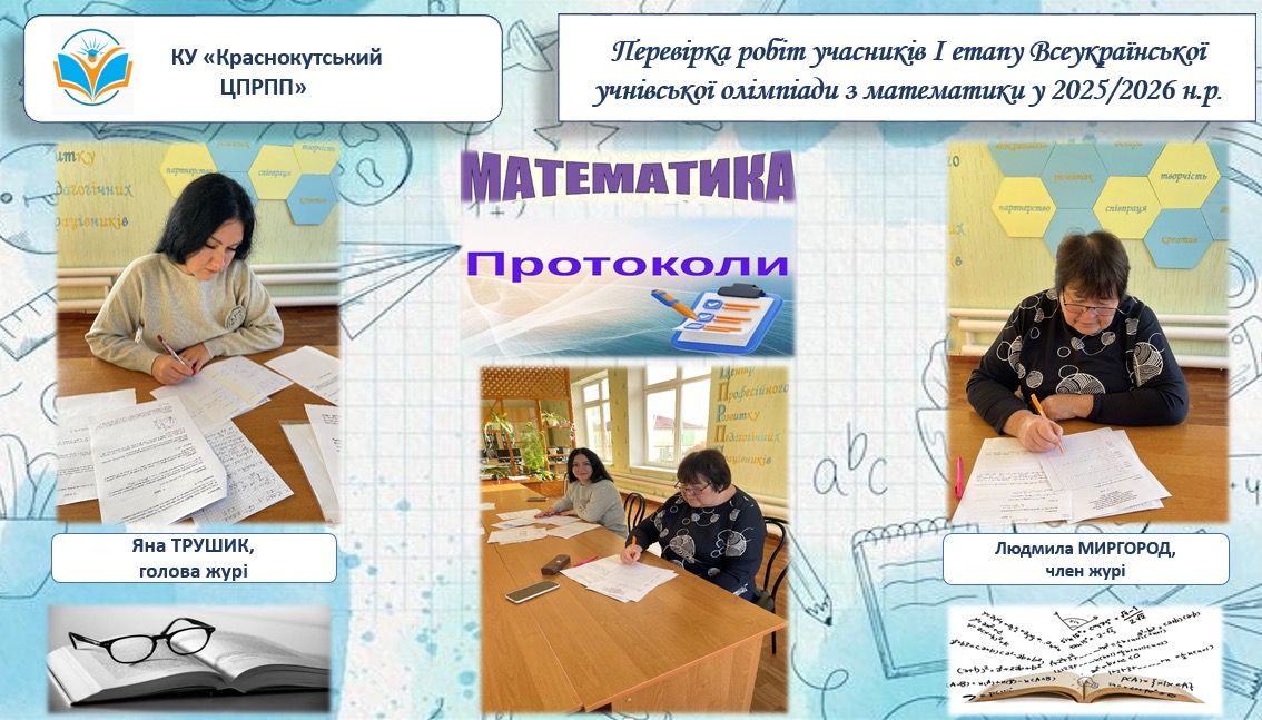 22.10.2025 на базі КУ “Краснокутський ЦПРПП” було організовано перевірку робіт І етапу Всеукраїнської учнівської олімпіади з математики в 2025/2026 навчальному році. Голова журі: Трушик Я.В., голова ТМО, вчитель Краснокутського ліцею №2.
