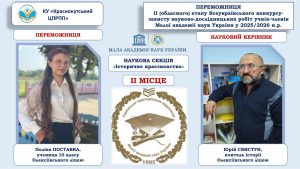 Вітаємо Поліну ПОСТАВКУ, ученицю 10 класу Олексіївського ліцею, переможницю ІІ (обласного) етапу Всеукраїнського конкурсу-захисту науково-дослідницьких робіт Малої академії наук України у 2025/2026 навчальному році! Поліна здобула ІІ місце у науковому відділенні історії, секція «Історичне краєзнавство», представивши дослідження на тему «Іван Гаращенко: меценат національного відродження в Харкові (підтримка освітніх та церковних проєктів)». Щиро пишаємося цим досягненням … Читати далі Вітаємо Поліну ПОСТАВКУ – переможницю ІІ (обласного) етапу Всеукраїнського конкурсу-захисту науково-дослідницьких робіт Малої академії наук України у 2025/2026 навчальному році